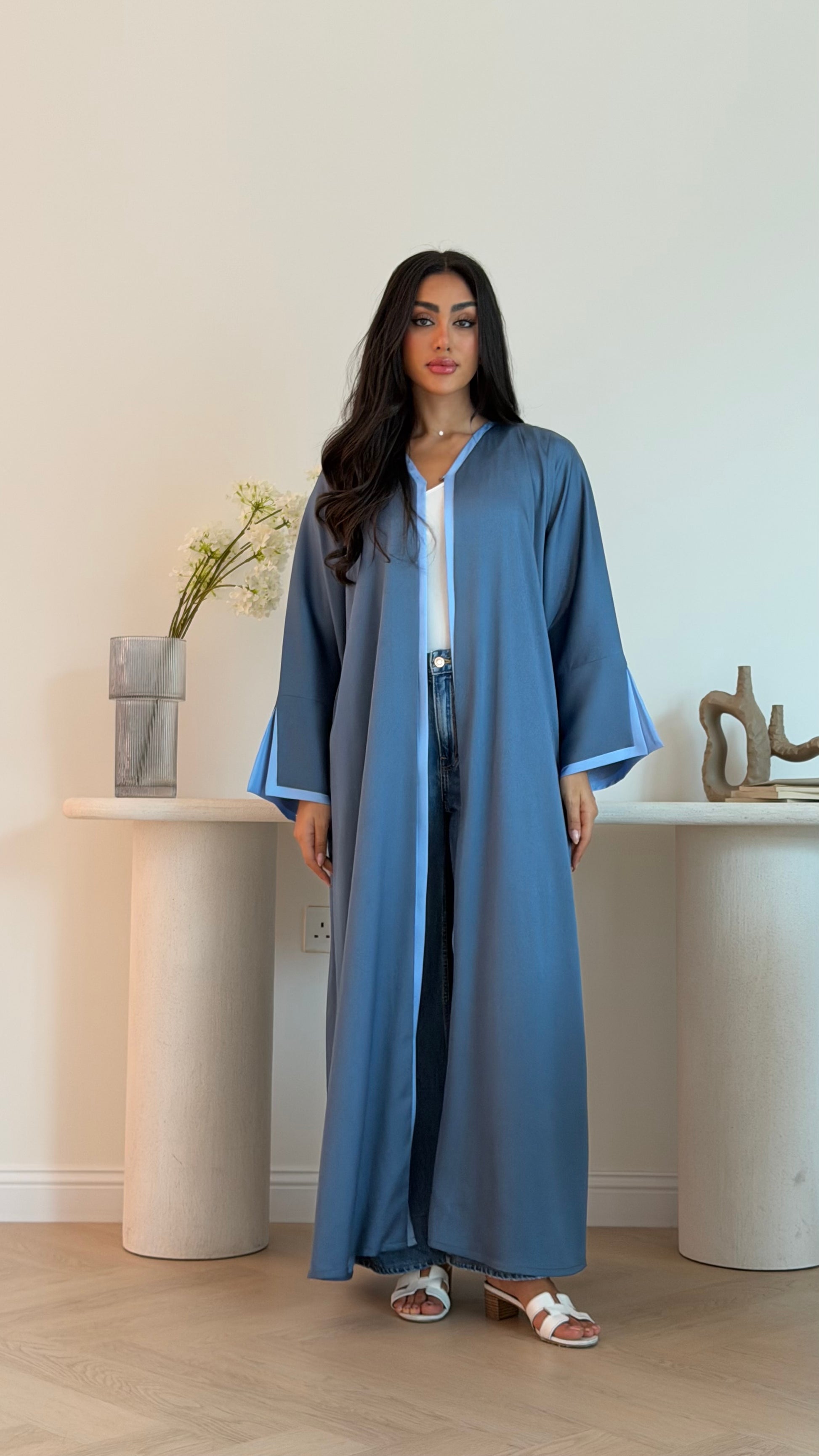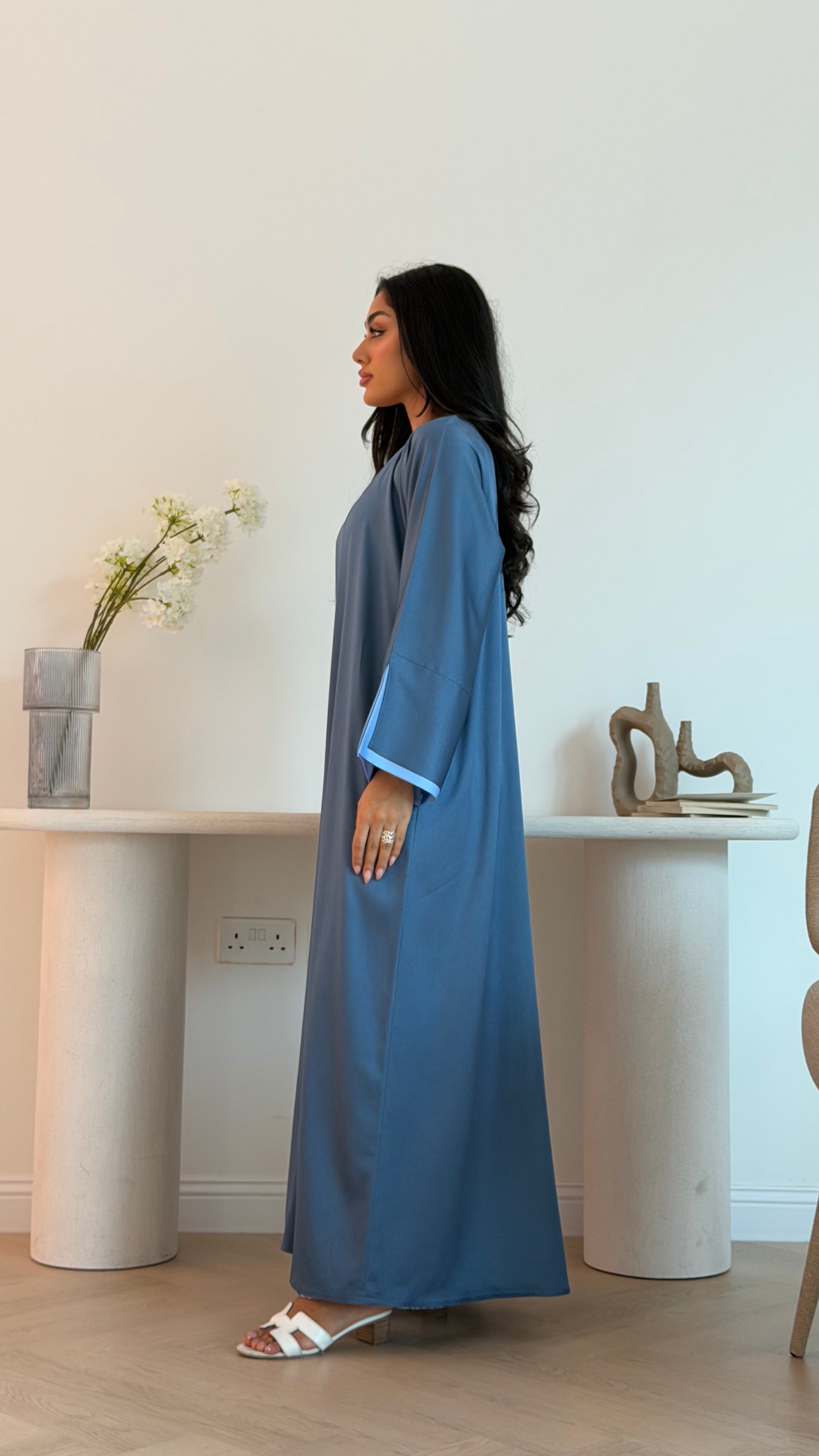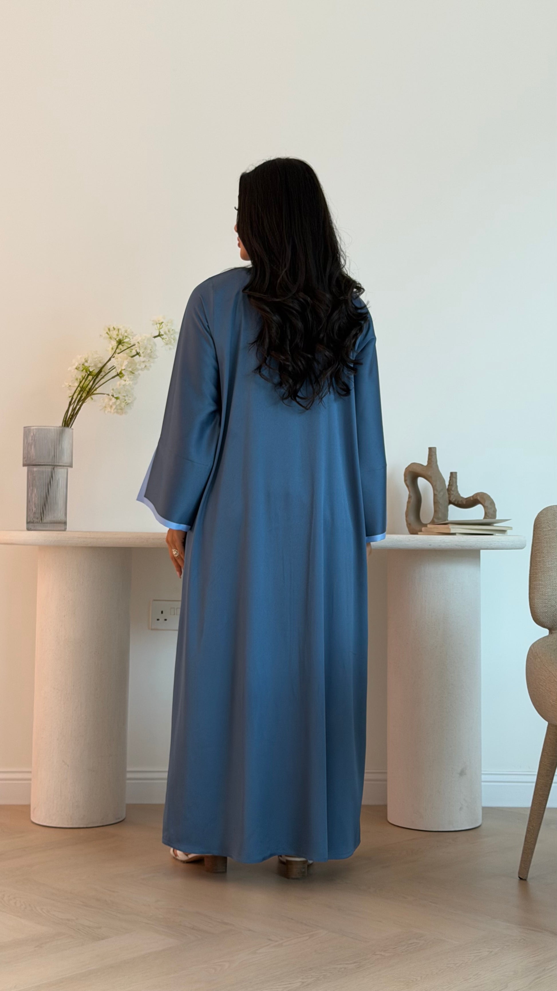 Discover the elegance of our Blue Topaz Abaya, a striking blue hue inspired by the stunning blue topaz crystal. Perfect for daily wear and special occasions, this piece is outlined with a lighter blue fabric and features shimmering accents for added sophistication.