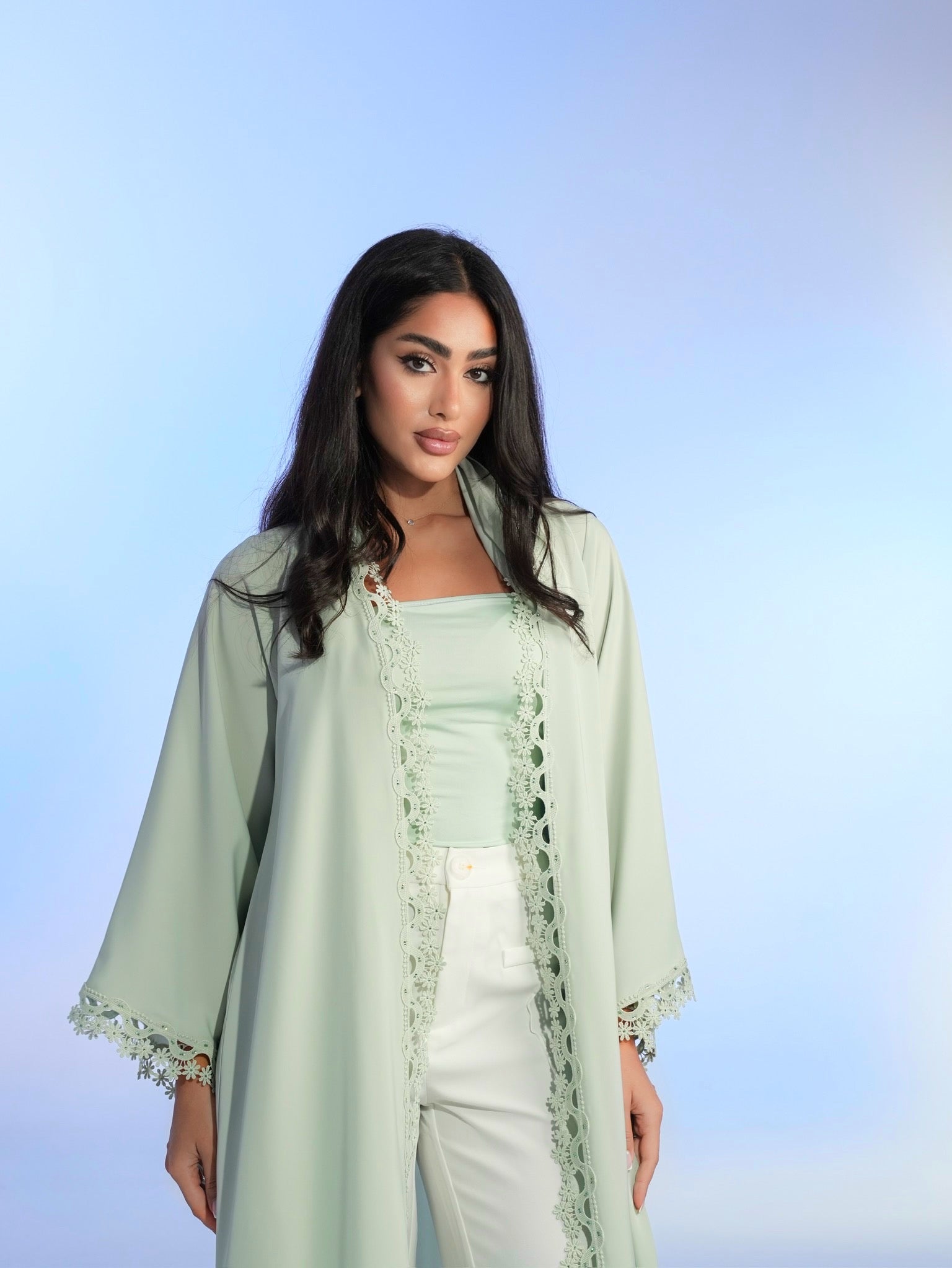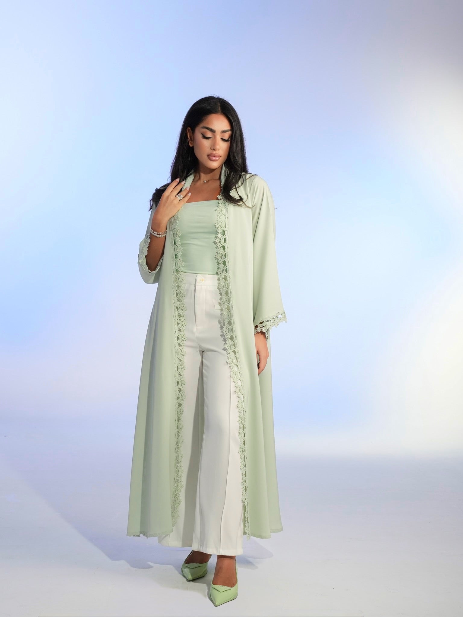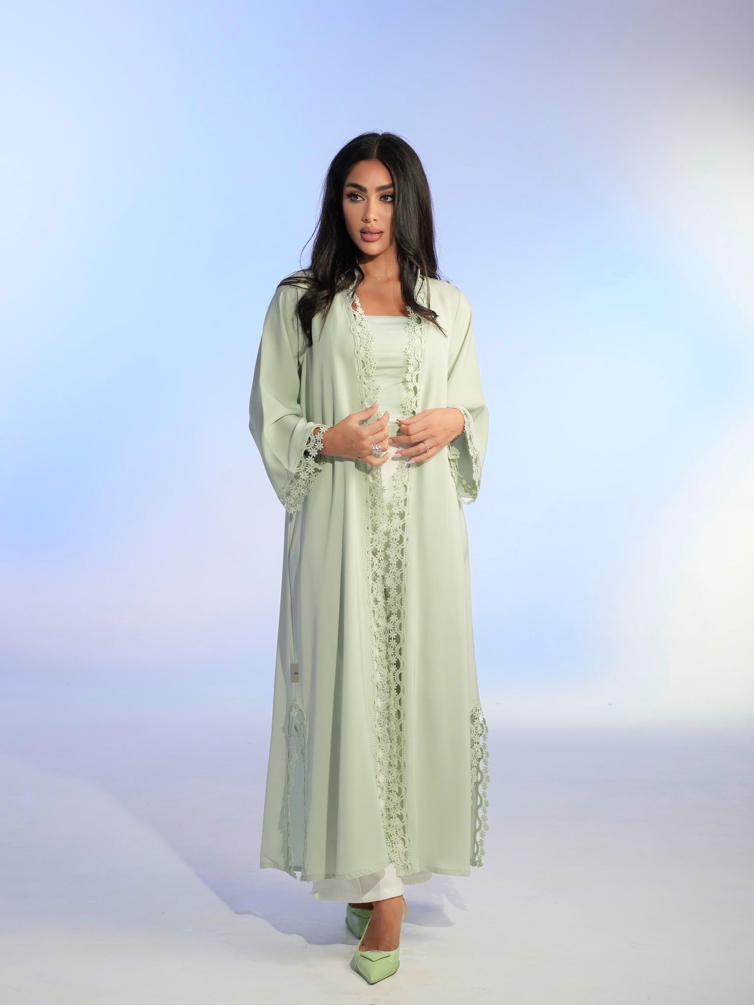 Elevate your wardrobe with our stunning pastel green lace Daisy Abaya, perfect for daily wear and special occasions. Lightweight and breathable, it’s ideal for summer.