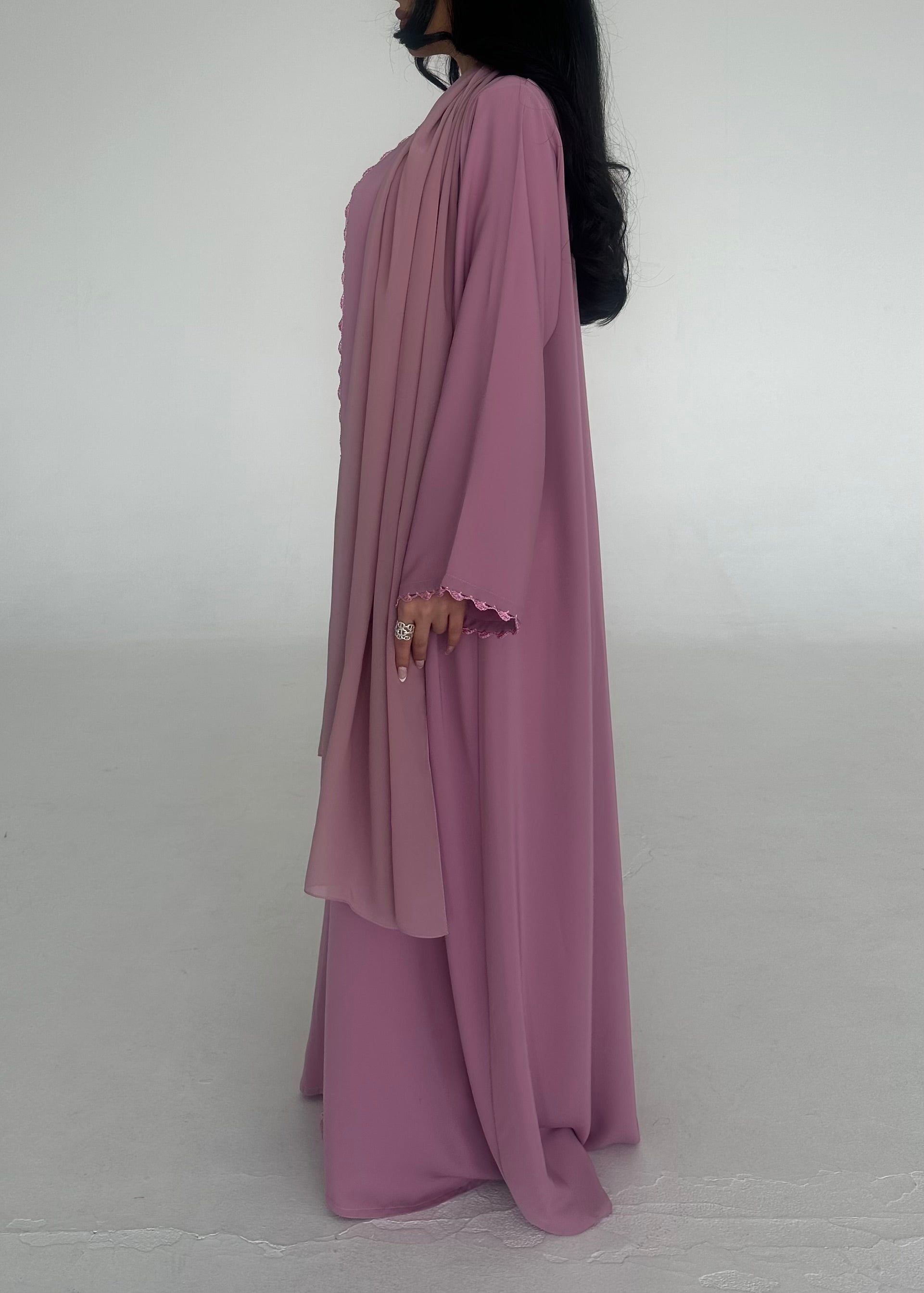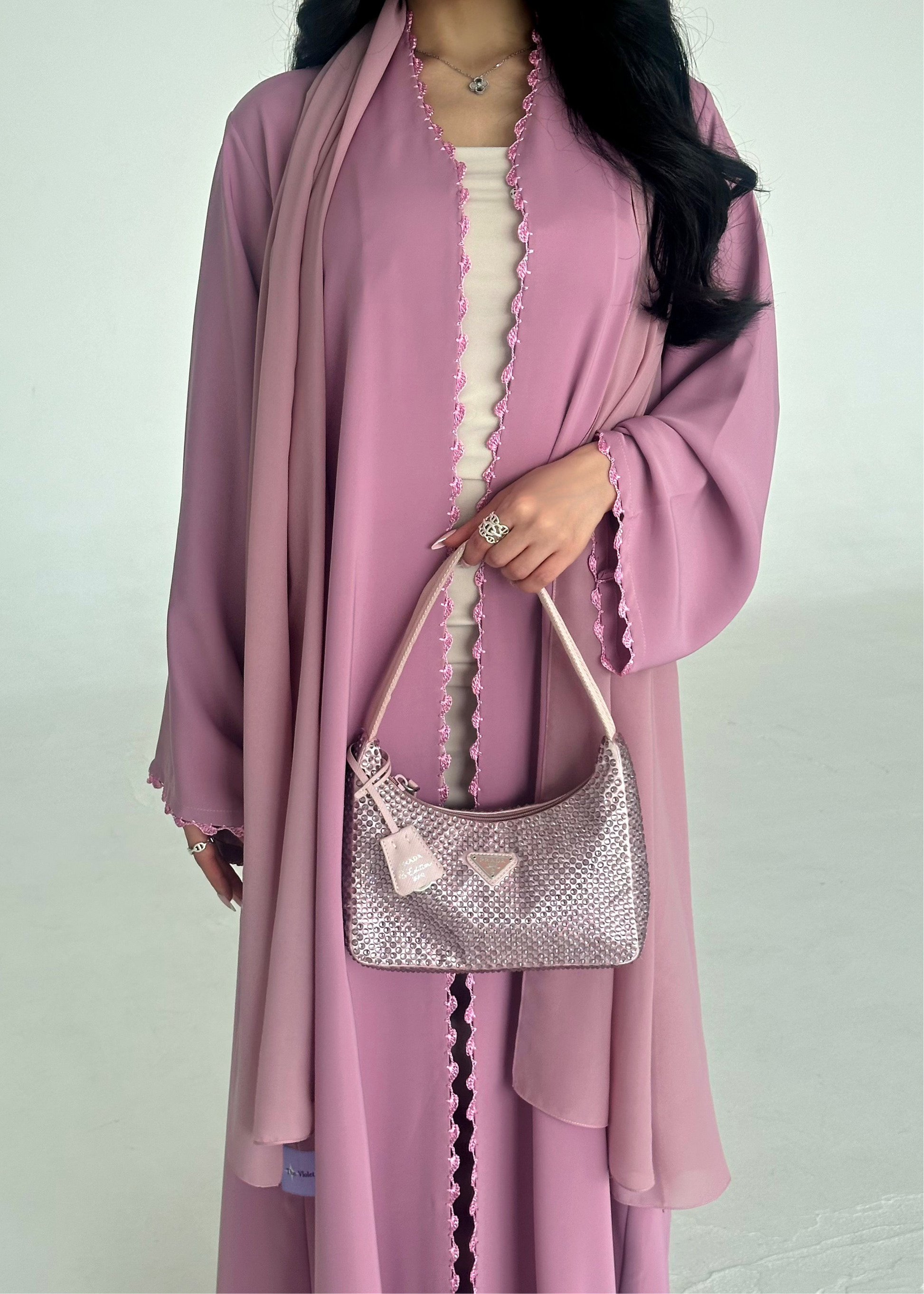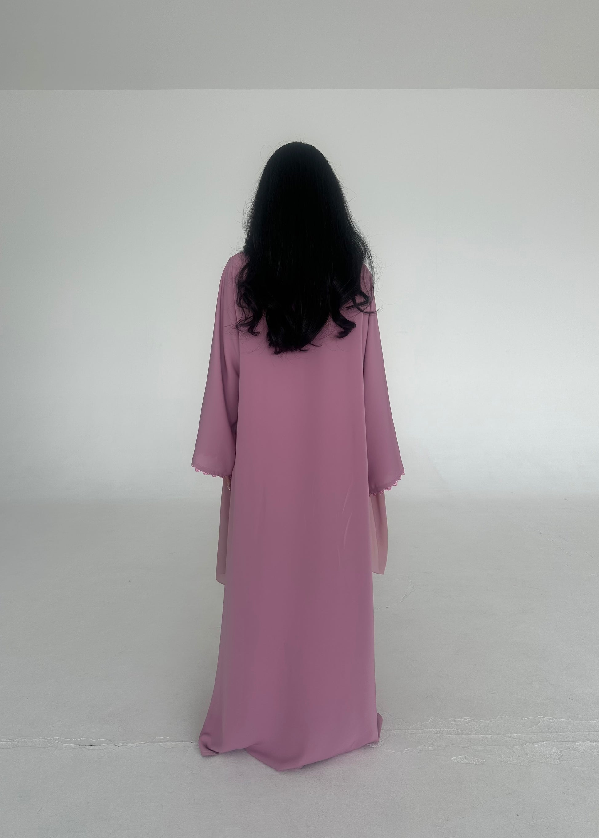 Discover elegance with our Fairy Abaya, featuring a soft pink color. This versatile piece has a flowing silhouette, perfect for both daily wear and special occasions.