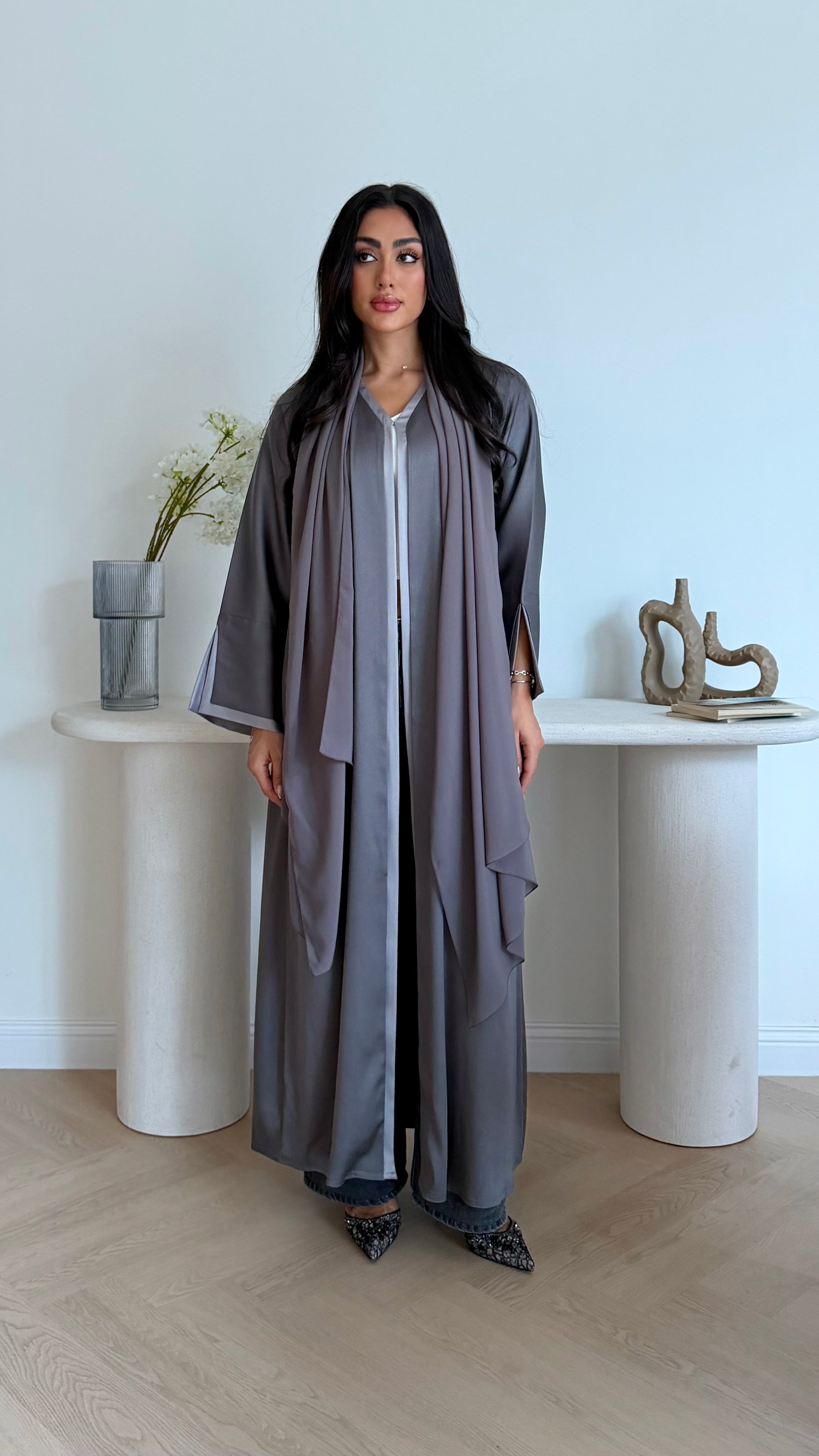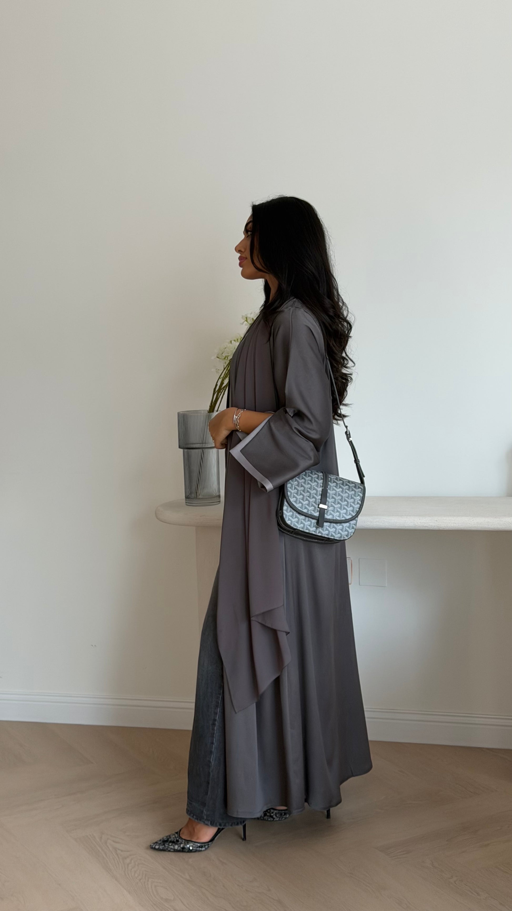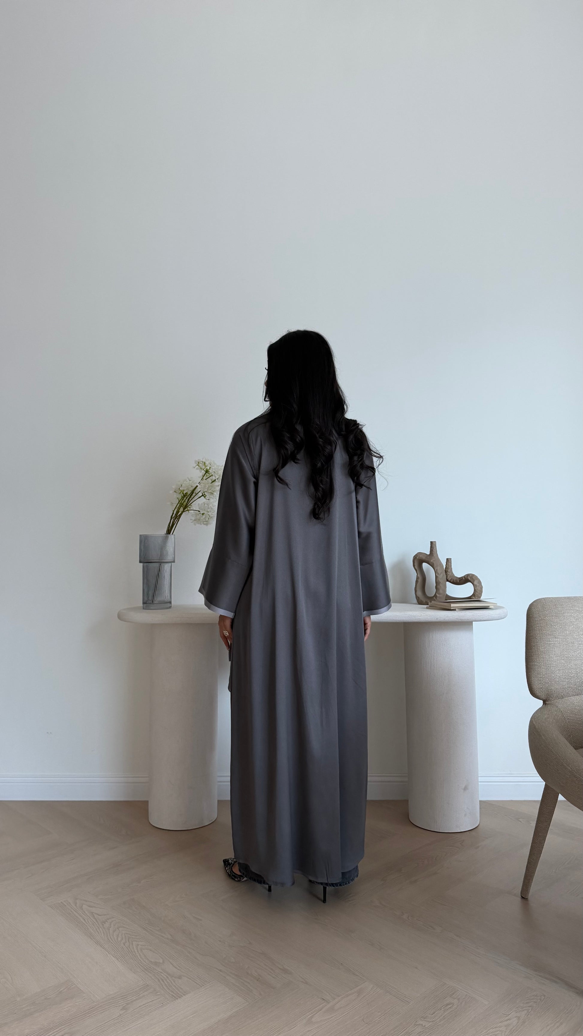 Discover the elegance of our Grey Agate Abaya, a sophisticated grey hue inspired by the beautiful grey agate crystal. Perfect for daily wear and special occasions, this piece is outlined with a lighter grey fabric and features shimmering accents for added sophistication.