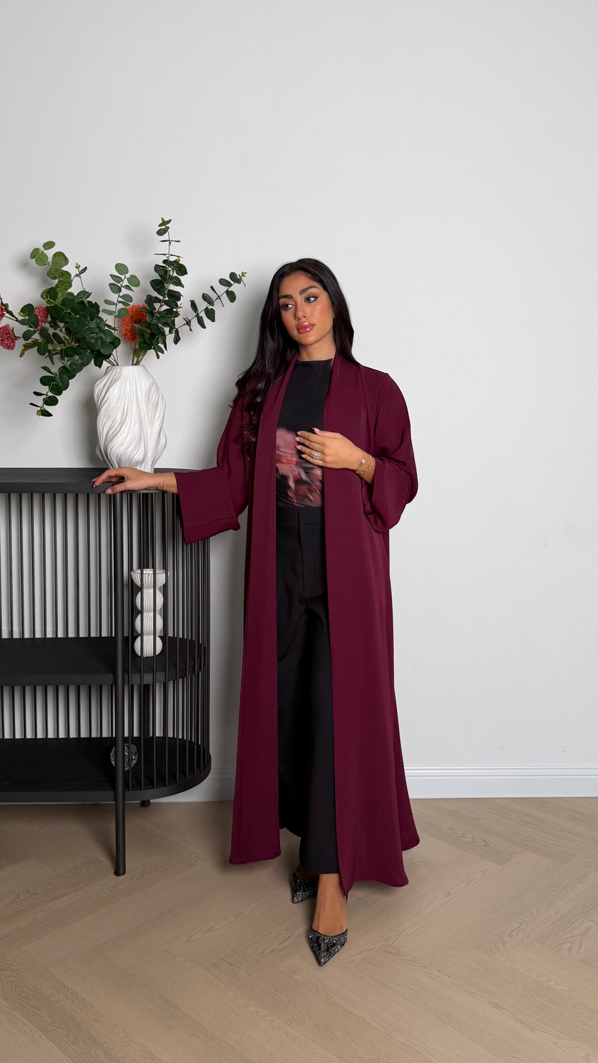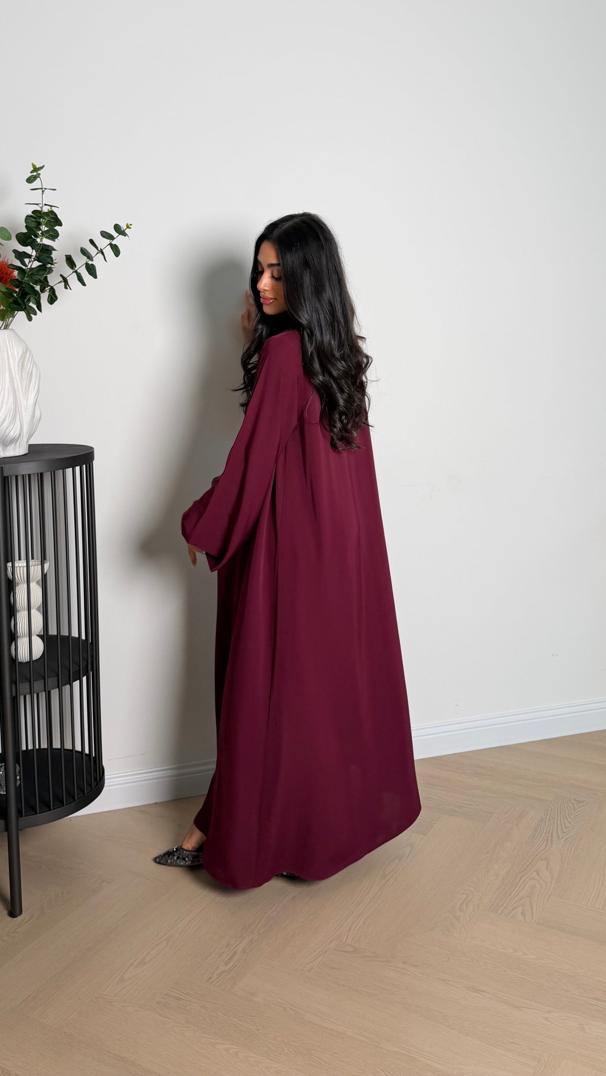 Discover the allure of our Ruby Abaya, a deep maroon hue inspired by the captivating ruby gemstone. This exquisite piece, crafted from Nada fabric, exudes elegance and sophistication, making it perfect for both daily wear and special occasions.